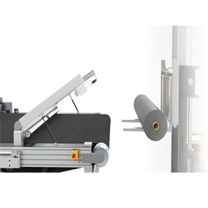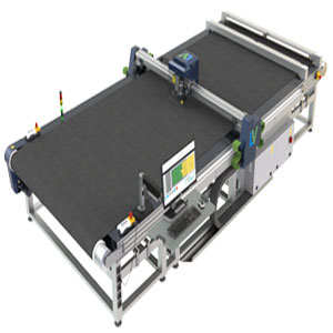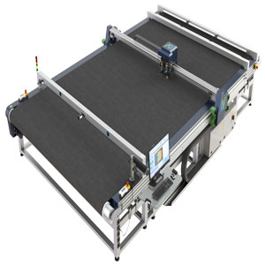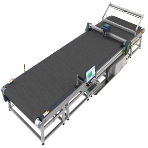 This means that the machine is equipped with a closed ring belt with the double function of background for cutting (sacrificial material) and means of transporting the material to be cut.